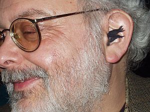 No, it is not a bug in his ear, it's a piece of black party napkin.
