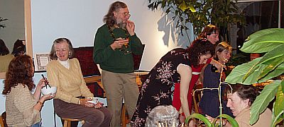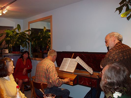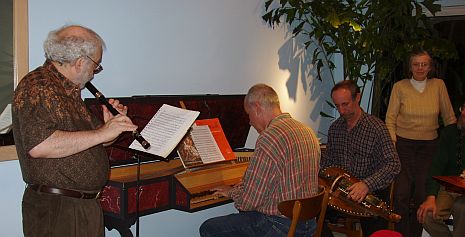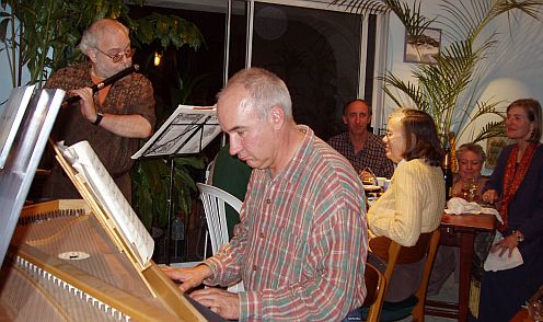 Before Kathy realized she needed her camera instead of a mixing bowl, Rick and Daniel had already finished playing their Elizabethan Dance arrangements (originally for lute and keyboard) on a renaissance flute made by Philippe Alain'Dupre, and Daniel was playing Willizam Byrd's 'Lady Carey's dompe' from memory and wishing he brought more music. They went on, Rick with a copy (by Rod Cameron) of a baroque flute by P. Bresson, playing two sonatas by Telemann and a CPE Bach sonata.