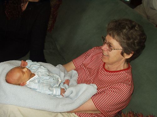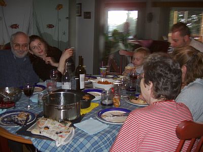 While he was sleeping we served a dinner we brought to share, and to celebrate Tim's birthday (It was December 25, but we waited until the baby was born to visit.) Here are the two 'drivers' Rick and Colleen, who made sure we got to San Diego, and let each other nap one way of the trip. Kathy did all the talking! (and cooking)