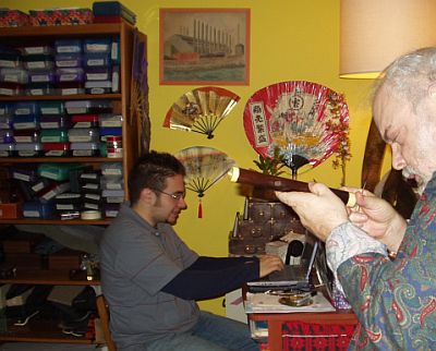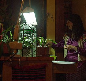 Sean took this photo of Kathy at her worktable, after dark, preparing some customer orders.