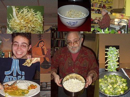 You'll see below on the upper left, Kathy and Rick's pasta substitute, thinly sliced cabbage with tamari and toasted sesame oil. We learned about it Kyoto, where it was served to us often, even at breakfast, which is our tradition. Sean really enjoyed it. We went to a different Indian restaurant buffet (Sitar) to round out the trip, and then for dinner we had an enhanced mini-pizza left over from the party and Kathy cut the last brussel sprouts off the giant stalk. Sean says 'Why do these have such a bad rap? Because they are little round balls? I wouldn't even try them when I was a kid.' But he loves them now. We have to say that if you can get them on the stalk (sometimes available at farmer's markets,we got it at our local natural food store) they taste best! At the end of the evening Rick said 'stand back!' and made his special popcorn.