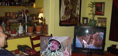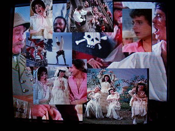 While we had pizza and popcorn, we finished the movie video we watched in installments over Sean's visit: The Gilbert and Sullivan operetta'The Pirates of Penzance' with Kevin Kline and Linda Ronstadt. Sean was not sure if he should like it, but after a while he was laughing along with us. He had to get used to our installment style of watching movies...we always need to go make a web page or something! See below for some views into the action. Rick took these photos of the TV screen at favorite moments, and Kathy did a collage...