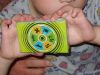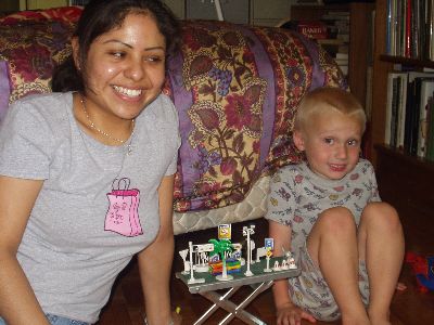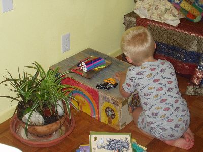 Kathy had collected many toys for Dylan during the weeks anticipating his arrival. Here he pauses for another inspiration. Notice the creative use of the musical foot rest.