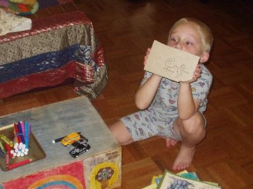 Dylan immediately set to work on his projects. The desk is one that Tim decorated with pictures when he was 7 years old. Rick and Kathy had brought the cardboard box (still all there, but so fragile) to the wonderful South Coast Fine Arts Conservation Center,in Santa Barbara, where our friend Carol Kenyon patiently restored it, removing all the papers and glueing them to a newly constructed wooden box. Now it is back with Tim, with a new life.