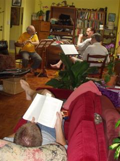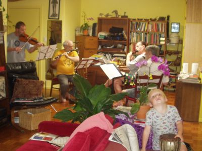 And this! Tim grew up playing baroque violin. He did not know it was hard. In the eighteenth century tradition he was just expected to play along in trios and quartets. In spite of his protestations that he has no time to practice, with all his family and work obligations, he brought his instrument, and played along as always, to everyone's delight. Harry, Rick, Doug and Tim are playing here. Dylan is accompanying.