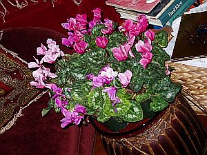 Harry had these cyclamen in mind before whe came to visit. He took Kathy to the mursery to smell each one. They are nose-picked for fragrance, and made the most beautiful arrangement that graced the Pasadena living room all week! The beautiful candle holder on the left was a gift from Harry, and accompanied our happy evening lava lamp.