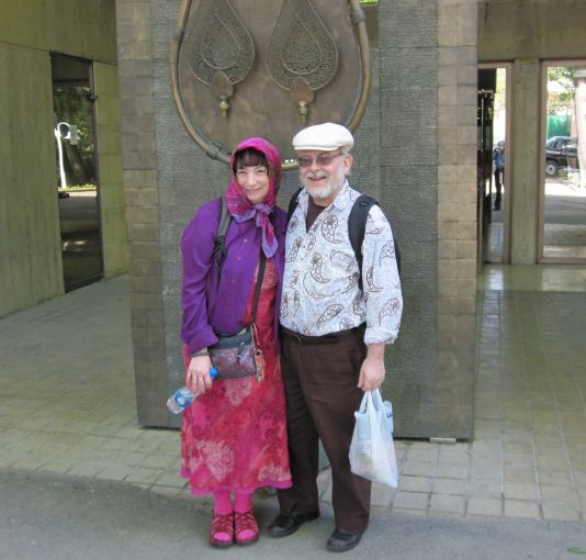 Rick in the guest house breakfast room near the photo of the old streets of Tehran. He is a little tired, since it is almost 4 am. The plane landed at 1:40 am and we were met at the airport by a driver with a sign. In the taxi the radio played poetry and traditional Iranian music.