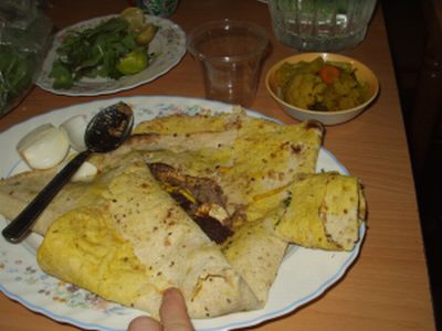 It was a special Isfahani dish, a light cinnamon and spicy ground mutton with walnuts, wrapped in a large round flatbread, with various accompaniments. We had not had anything like it during our stay in Tehran.