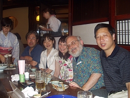 D..............After the first conference day, was the opening conference DINNER. It was absolutley the most amazing feast we have experienced anywhere yet. At a famous sushi restaurant, with kimono dressed waitresses, an endless array of exotic delicacies followed one another, accompanied by endless toasts of beer and cold sake. It was a jouful time, full of laughter, the greeting of old friends, and mathematical jokes.