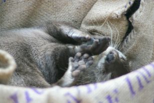 We went to see our otters at the zoo in Santa Barbara before we left for Pasadena on Monday morning. They had just been fed, and were not swimming, but playing in their basket. Sorry this first photo is out of focus, but they were moving. One was in the burlap-lined basket, and the other to the right.