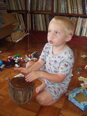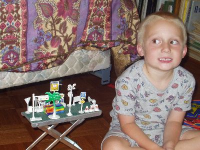 Kathy had collected many toys for Dylan during the weeks anticipating his arrival. Here he pauses for another inspiration. Notice the creative use of the musical foot rest.