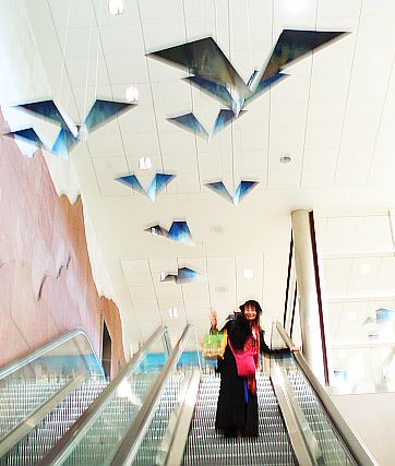 On the escalator, Denver sirport...the "paper airplanes (painted metal sculptures?) are hanging every where...we loved them!