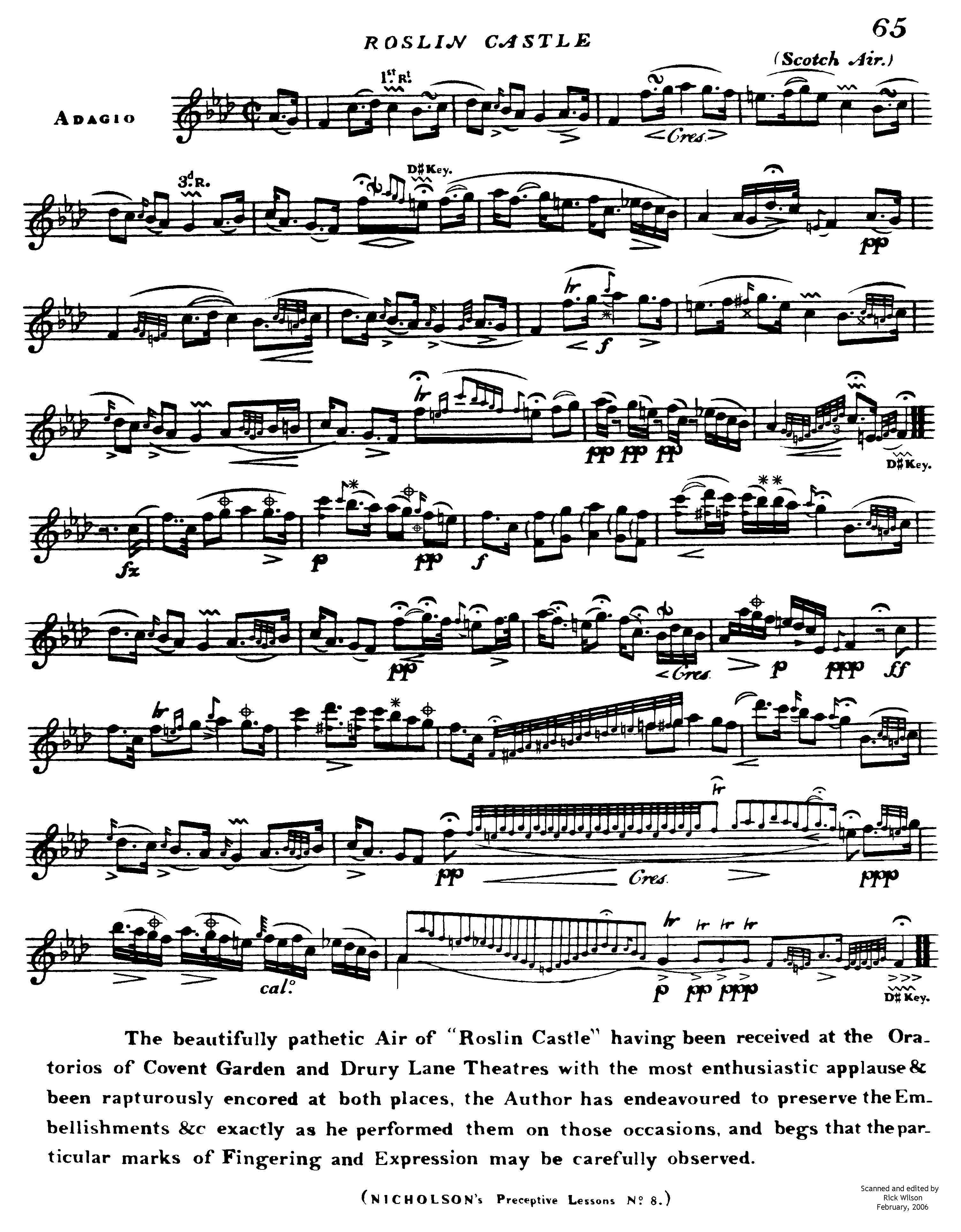 A taste of Nicholson's style can be gleaned from his arrangement and embellishment of the Scotch air Roslin Castle, which appeared in his Preceptive Lessons for the Flute of 1821. It might be hard to believe that anyone ever played like this, had we not this documentation. When played as he directs, and with feeling and understanding, his arrangement can still speak to and greatly move a modern audience. We make this arrangement available in facsimile form below.