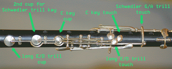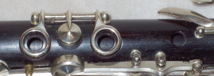 The first of these was the brille with ring keys for finger holes 1 and 2 and an additional pad for a small tone hole between finger holes 1 and 2. The ring keys and cup moved together, rotating on an axle.