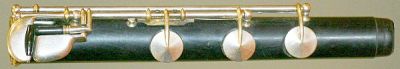 (2) Axles and foot. The foot joint keys on many 19C flutes, especially in their current conditions, are not always reliable. The construction with axles and needle springs used on modern flutes and Schwedler's flutes would appear to be more sure in its action and less likely to get out of adjustment. It facilitates some movements, say from d'# to c'# and back, that can be very awkward on some old-style foot joints. (But I personally prefer the position of the low C# key on the old-style foot when that key is often used for the sensitive fingering of c''#, namely, -23456 with the low C# key, which fingering was much used in the early and mid-19th century.)