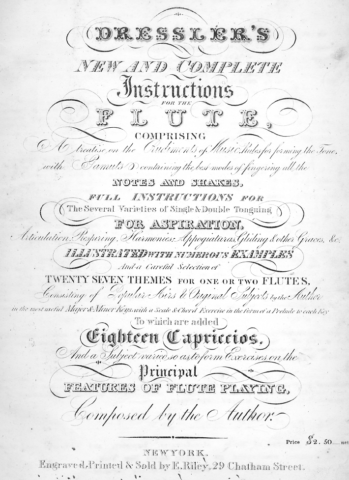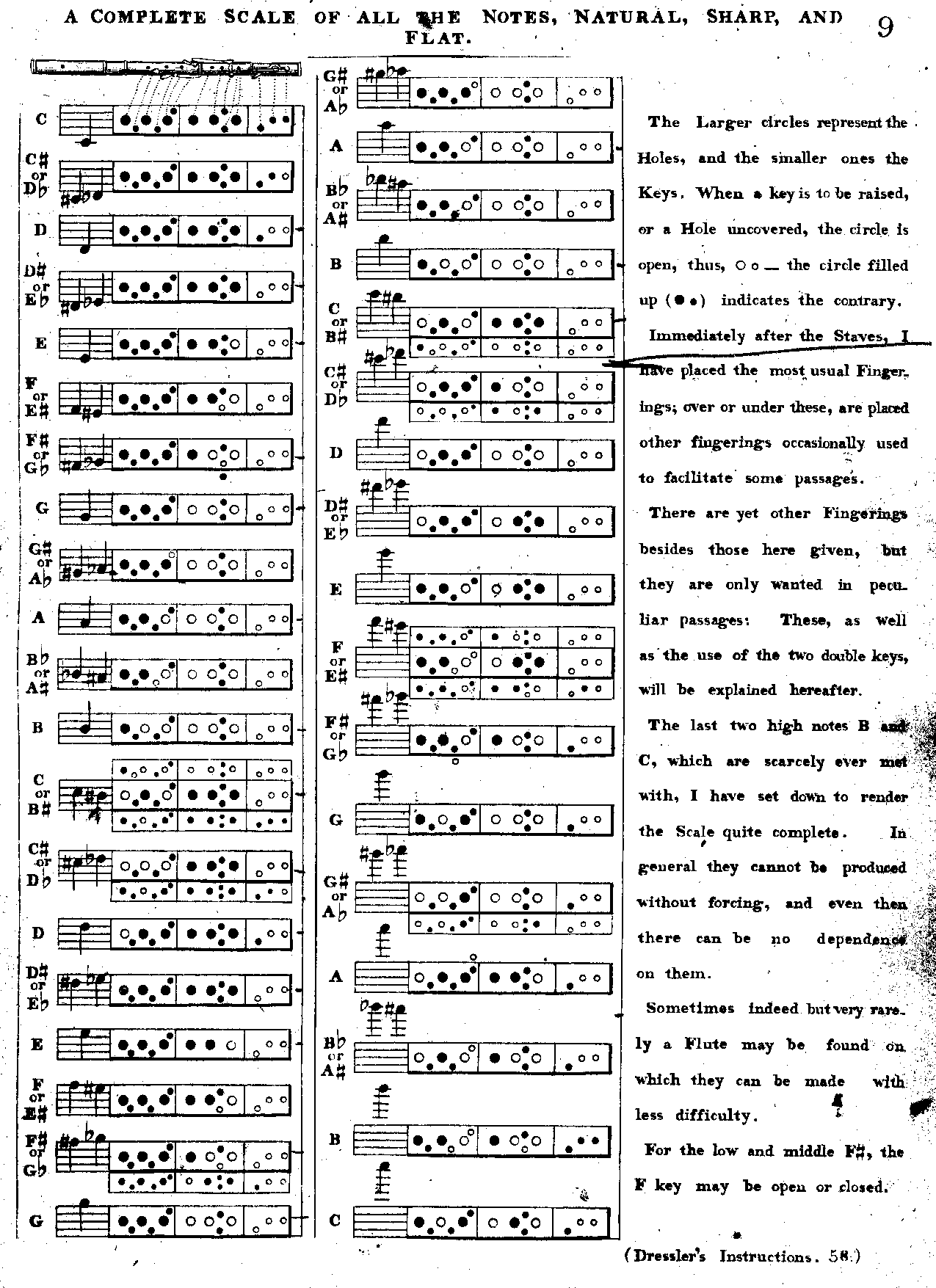 Raphael Dressler (1784–1835) was an Austrian flutist and composer who spent the years 1820–1834 in London, where his flute method was first published. The fingering chart is for the eight-key flute, but Dressler played an 11-key flute at the time, with a low B (common on contemporary Viennese flutes, but not on English flutes), two keys for Bb, and three keys for F natural.