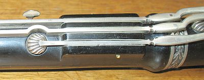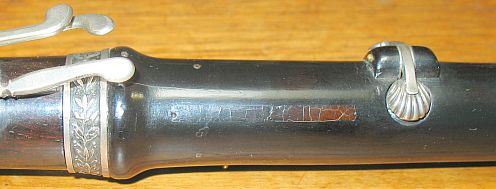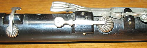 There is no evidence at this time of a previous 'finger' on the end of the D# key for the end of an extra D# lever, but a slight abrasion or scratch is visible on the surface of the wood just to the right of the D# key cup. This abrasion could have been wear from the end of an extra D# lever.