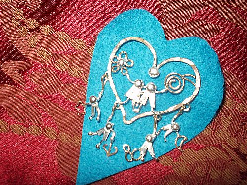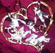 This family pendant shows a mother and father holding their boy's hand and their two pets, at their feet, all inside of the family heart. All of the figures are contained in the heart. The piece below shows the children (or grandchildren) dangling from the parents, who are inside the heart.