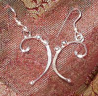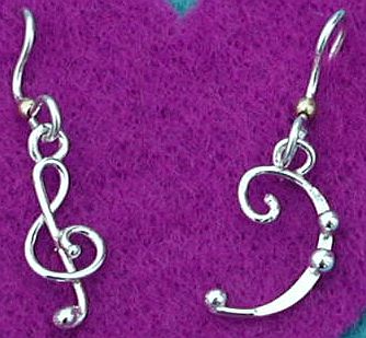 It is hard to find the bass clef in an earring design, especially handmade! Here are both treble and bass. Perfect for keyboard players and music lovers. Sterling silver, about 3/4 inch long. Light and elegant. $25. (You can specify two trebles.) See two bass clefs above. Longer lengths add $5.