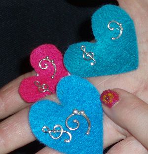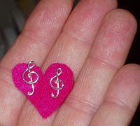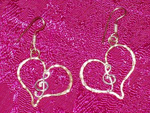 A heart shaped earring, this one is a gold heart outline with a silver treble clef. Options would be: all sterling silver clefs and heart; all gold filled; a treble clef inside one heart and a bass clef inside the other heart earring. Any of these variations: $50. For all 14k or combination of 14k and silver, email and ask. Size is up to you. these are bigger than a quarter. Measure how large you'd like them.