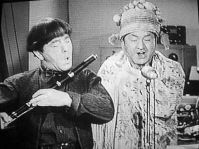 The following images are from The Three Stooges' Micro-Phonies (1945). It is one of their better efforts, I would say. Highly recommended. Anyway, Moe is faux-playing to the sound of a recording of a silver flute, but he is "playing" a simple system flute, Meyer-style, with a B-foot and nine keys (maybe more, but I can't see). He has a charming way of putting his right hand fingers on the cups of the foot joint keys, rather than on the finger holes!