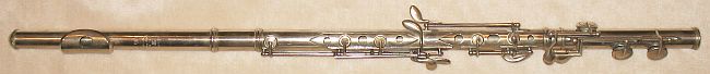 This flute has a cylindrical body and foot with a "parabolic" head joint, the same shape as the modern Boehm flute. But here the instrument is constructed as a simple system flute, with six finger holes and seven closed-standing keys on the body. The total ten keys are those of the usual eight-key flute plus two more: a high e'''/d''' trill key and a Tulou F# key. The keys are mounted on rods; needle springs throughout.