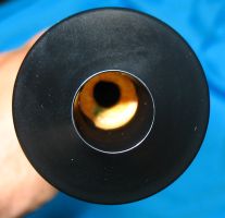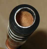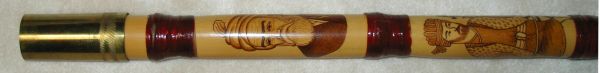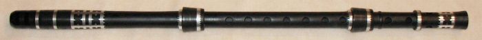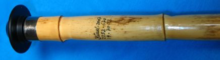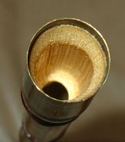 The bore is basically cylindrical, but retains the natural interior walls of the reed, which, of course, are not completely smooth or cylindrical. The nodal dams of the reed are mostly removed, but the bore remains a but lumpy. The material under the first node, near the blowing end, is only perforated, so that there is a constriction in the bore at this point.