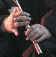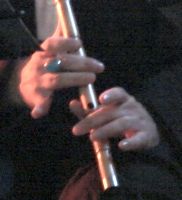 Persian neys are made in many sizes; a common size has low note c'. There are five finger holes on the front, and one thumb hole in the back. The bottom two holes are covered by the first and third fingers of the lower hand, while the second finger of that hand supports the ney by remaining fixed in a position between the two bottom holes. Click for a fingering chart. As the fingers are raised one-by-one from the all-holes-covered position, the following intervals are produced: whole tone, small whole tone, large semitone, semitone, semitone. So all-fingers-off produces g', and then opening the thumb hole gives a'. The notes b'b and b' are missing, though with the embouchure, when time permits, the second octave c'' can be flattened to give b' and the first octave a' can be sharpened to give b'b.