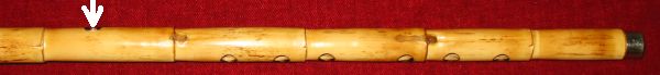 There are seven holes, six finger holes that are relatively close together and low on the tube, and a thumb hole in back quite a bit higher than the highest finger hole. The thumb hole on the Turkish ney is used only for a small range of notes at the top of the rarely-used low octave. It is normally kept closed.